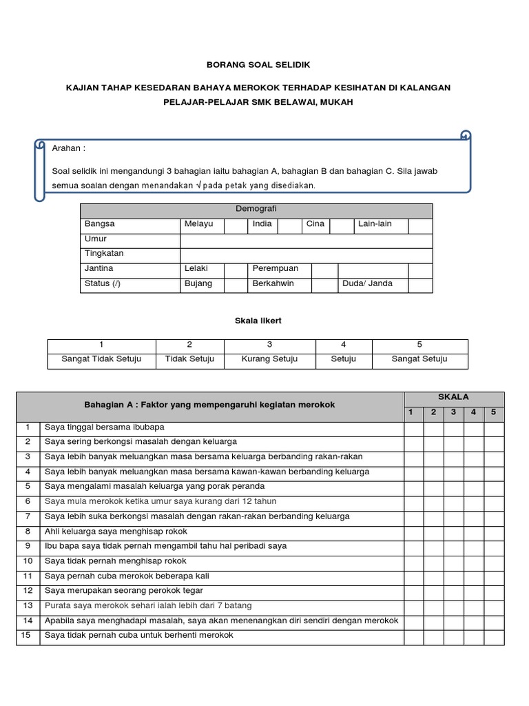 Contoh Borang Soal Selidik Kajian Merokok from imgv2-1-f.scribdassets.com Borang soal selidik via www.scribd.com. Contoh borang soal selidik untuk demografi 30 responden pengajian am stpmfull description. Contoh borang soal selidik (maklumat diri responden). Savesave contoh borang soal selidik kajian pengajian am for later. Contoh borang soal selidik geografi migrasi dalaman via sportschuheherren2.blogspot.com. Panduan buat calon pt3 yang sedang membuat satu tugasan kerja kursus geografi pt3 tahun 2018. Borang soal selidik ini mengandungi empat bahagian yang terdiri daripada bahagian a, b, c dan d. Sebagai contoh, satu soalan pada borang soal selidik mungkin boleh digunakan bagi mendapat jumlah ataupun agregat tidak rasmi dalam pemilihan pengerusi, presiden ataupun wakil kepada seusatu organisasi.